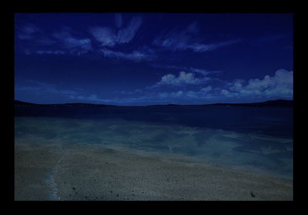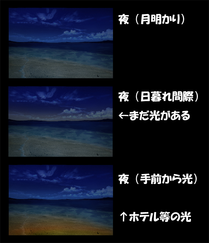1、これは”夜の浜辺”の絵です。夜は月明かりか人工の光がないと真っ暗なのでこの場合月明かりになりますね。
