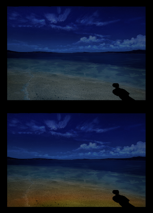 これって実は夜と昼、光と影を描くのに必要なことでして、例えば、月明かりも街明かりもないところにキャラクターが演技をするとしますと、さて、どうしよう。
