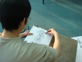 アニメ彩色科、CGデザイナー科は、前回からフィギュアを描いています。今回は、フィギュアを見上げて(アオリ)描くことをしました。距離感や、迫力感を出していこう!