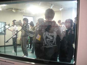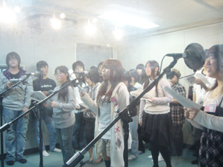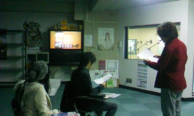 最初に映像を見て台詞を確認。その後マイクとの距離の取り方や簡単な発声練習をやったあと、2班にわかれて実習しました。